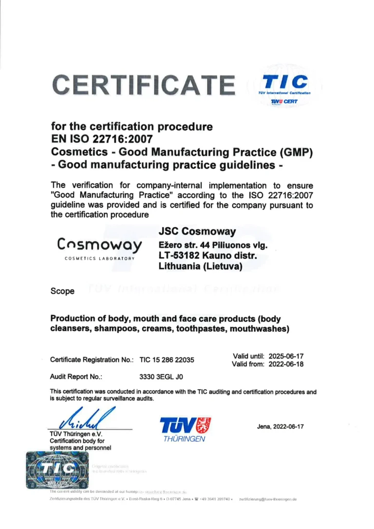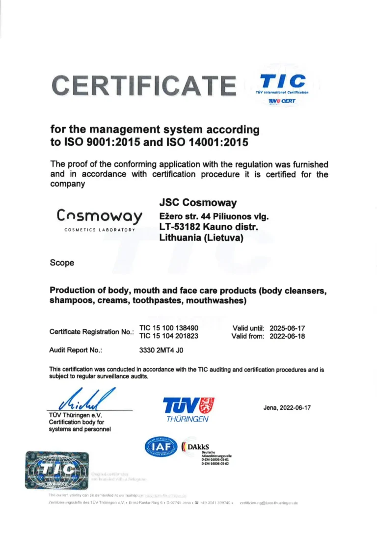 UAB “Cosmoway” is a cosmetics manufacturing company that has implemented an integrated management system of quality, environmental protection, and good manufacturing practices, complying with the requirements of LST EN ISO 9001:2015 “Quality Management Systems. Requirements,” LST EN ISO 14001:2015 “Environmental Management Systems. Requirements and Guidelines for Use,” and LST EN ISO 22716:2008 “Cosmetics – Good Manufacturing Practices. Guidelines on Good Manufacturing Practices (ISO 22716:2007)” standards.